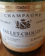Ik koos voor een Blanc de Blancs uit Avize van wijndomein Fallet-Crouzet (er kan ook Fallet-Prévostat op het etiket staan, wat dezelfde wijn is). Het domein van de familie Fallet bestaat sinds 1960 en is slechts 4,5 hectaren groot, of klein. Het is een Grand Cru op basis van 100% chardonnay. Vader Michel Fallet oogstte als een van de eerste wijnboeren in Avize heel rijpe druiven ‘raisins surmaturité”. Een deel van de wijn vergist in betonnen cuves en een ander deel in oude Elzasfusten. De basis van deze wijn is het oogstjaar 2010. Daarvan wordt één derde gebruikt. Daarnaast wordt één derde wijn uit 2009 en één derde uit 2008 toegevoegd. In mei 2011 werd deze assemblage gebotteld en weggelegd in de ondergrondse kelders. Daar bleef hij acht jaar ‘sur latte’. Het dégorgeren van de wijn gebeurt ‘à la volée’, wat volledig met de hand betekent. Mijn wijnkeuze is een extra brut, bij het bottelen werd drie gram dosage toegevoegd. Voor de degustatie serveerden we deze complexe en aromatische wijn op 10°C. Omwille van zijn rijke aroma’s schonken we de wijn in een breed spiegelau glas.