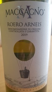 De kleur van deze arneis is aantrekkelijk. Hij heeft een licht goudgele kleur met mooie opvallende schittering. Ik bemerk een lichte pareling die na opschudden zal verdwijnen. De geuren zijn kenmerkend voor goede arneis, met een aanzet van citrus die snel overgaat in rijpere aroma’s waarin ik meloen en rijpe peer herken. Na opschudden komen florale geuren, amandel en wat kruidige tonen opzetten. Het geheel is complexloos maar heel eerlijk en zuiver. De aangename geuren worden bevestigd in de lekkere smaak. Het eerste contact is fris en fruitig en vrij expressief. Wat later komt de zachte kant van arneis opzetten en wordt hij fluwelig en rond. Hij eindigt met een fijn zuurtje in de middellange afdronk. Alles zit in evenwicht in deze elegante wijn. Toen we bij de Maccagno’s op bezoek waren dronken we deze geslaagde wijn bij de huisgemaakte ravioli in boter en groene kruiden en vandaag waren we enthousiast over de combinatie van risotto met kastanjechampignons en gebakken mooie meid. Hij is drinkklaar en heeft twee tot drie jaar reserve.